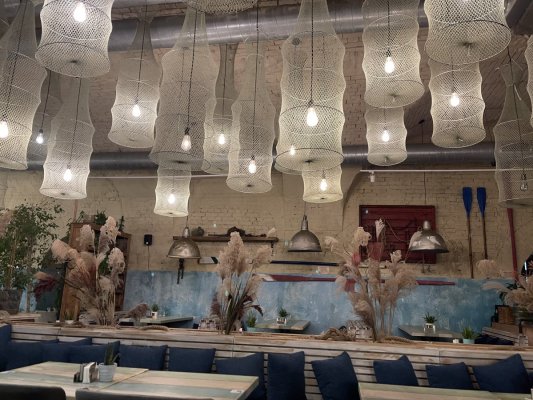 Інтер'єр ресторану прикрашений в морському стилі, що створює неповторну атмосферу одеського узбережжя. Декор, що нагадує про море і портові міста, додає колориту та підкреслює тему закладу.